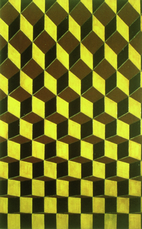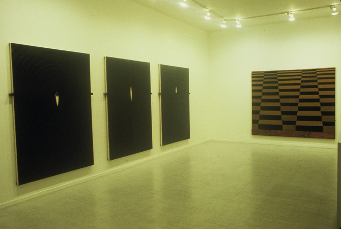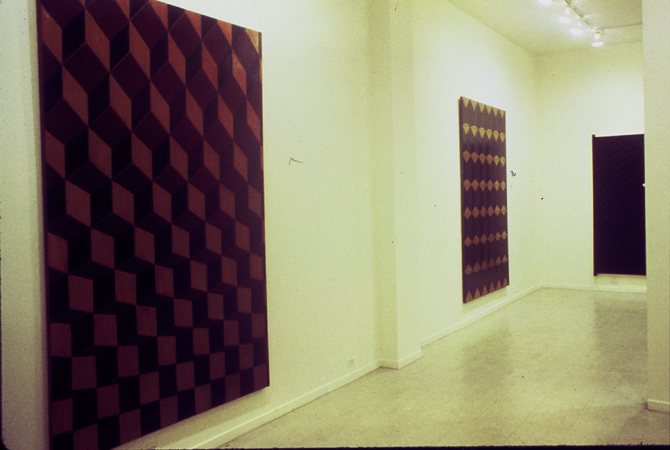 | UNTITLED Oil o/ Canvas, Wood 49 3/4 ''x 48 1/8'' | Persistence of Vision Oil, Linen 9''6 x 60'' | Prospect Oil o/ Linen w/ Wood58'' x 96'' | The Room (That We Seek) Oil, Linen 96 x 60'' | The Room Oil, Linen 96 x 60'' | Woven Space Oil, Linen 96 x 60'' | Vertical Space Oil on Linen 86 x 50'' | The Silence O/c, w/ Wood 52 x 36'' | Installed POSTMASTERS NYC: Thought Planes I, II, III, Our Prospect | Installed POSTMASTERS NYC: Persistence of Vision, Woven Space | Cubes Oil on Linen 5' x 5' |